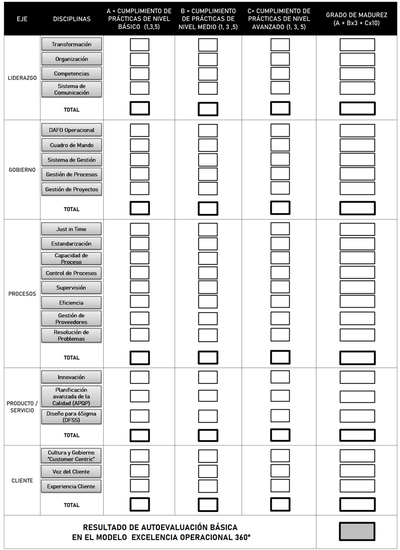 Plantilla para la autoevaluación básica en el Modelo de Excelencia Operacional 360º, que se puede realizar a partir de las buenas prácticas descritas en el manual EO360º